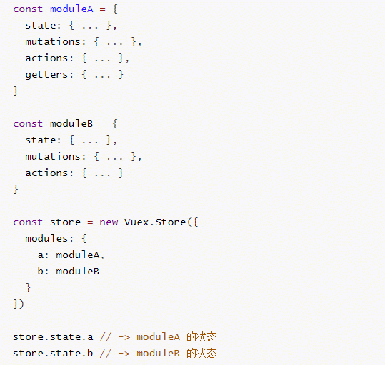 Vue使用单一状态树,那么也意味着很多状态都会交给Vuex来管理.当应用变得非常复杂时,store对象就有可能变得相当臃肿.为了解决这个问题, Vuex允许我们将store分割成模块(Module), 而每个模块拥有自己的state、mutations、actions、getters等.