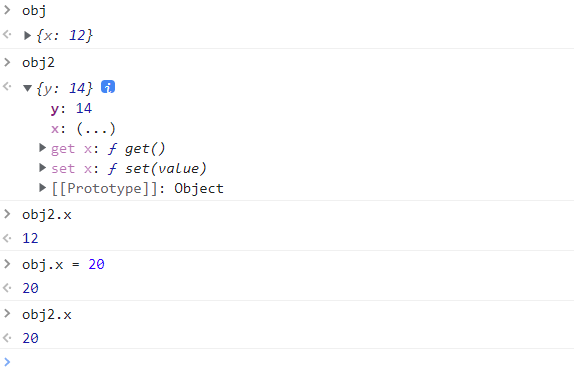 | <script> let obj = {x:12} let obj2 = {y:14} Object.defineProperty(obj2,'x',{ get(){ return obj.x }, set(value){ obj.x = value } }) </script>