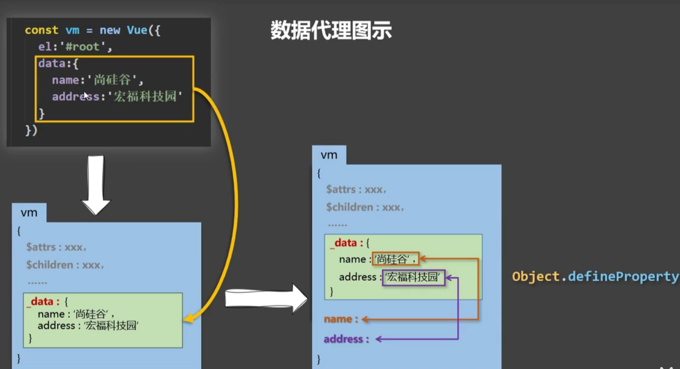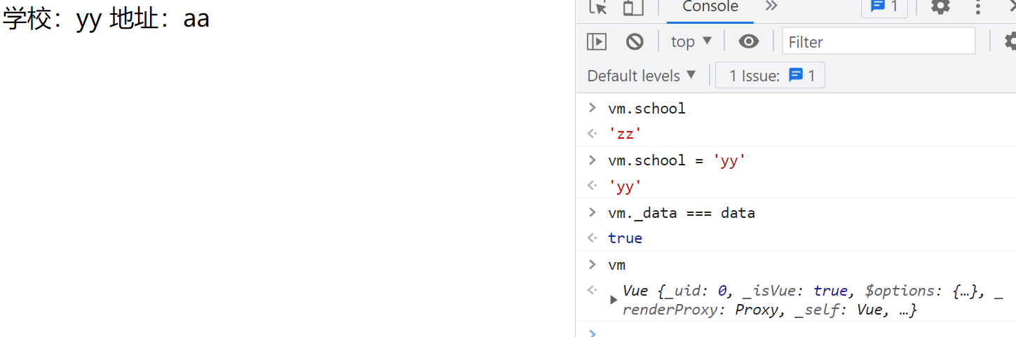 | <body> <div id="app"> 学校:{{school}} 地址:{{address}} </div> </body> <script type="text/javascript"> let data = { school: 'zz', address: 'aa' } const vm = new Vue({ el: '#app', data }) </script>