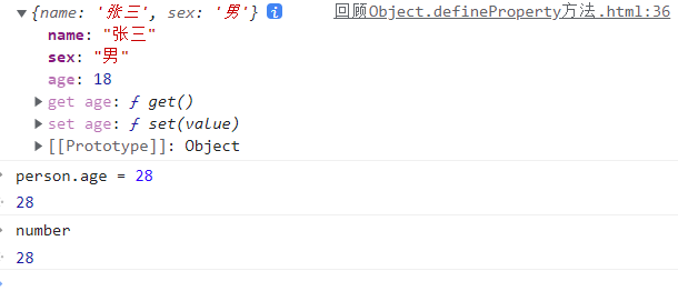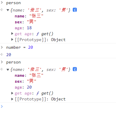 | <script> let number = 18 let person = { name: '张三', sex: '男' } Object.defineProperty(person,'age',{ get(){ return number }, set(value){ number = value } })